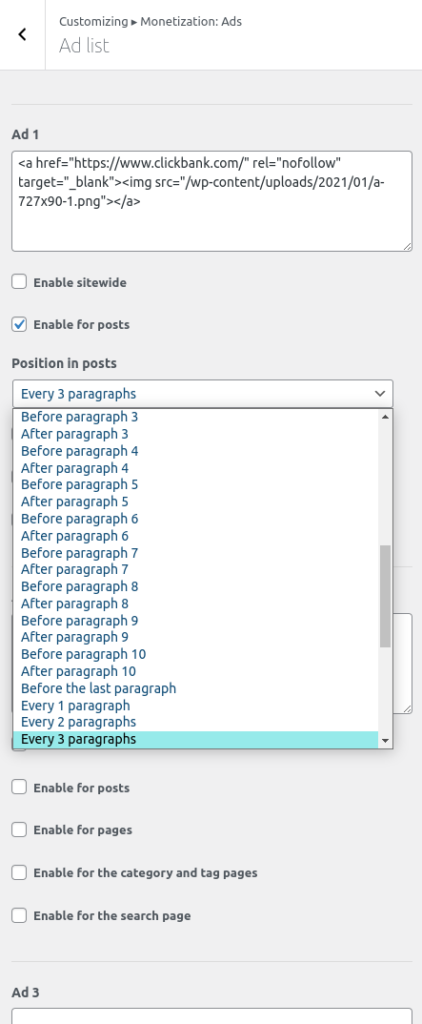 These are some options, but there are more. Just open the dropdown in the configuration options. You can also disable ads on individual pages with one click.